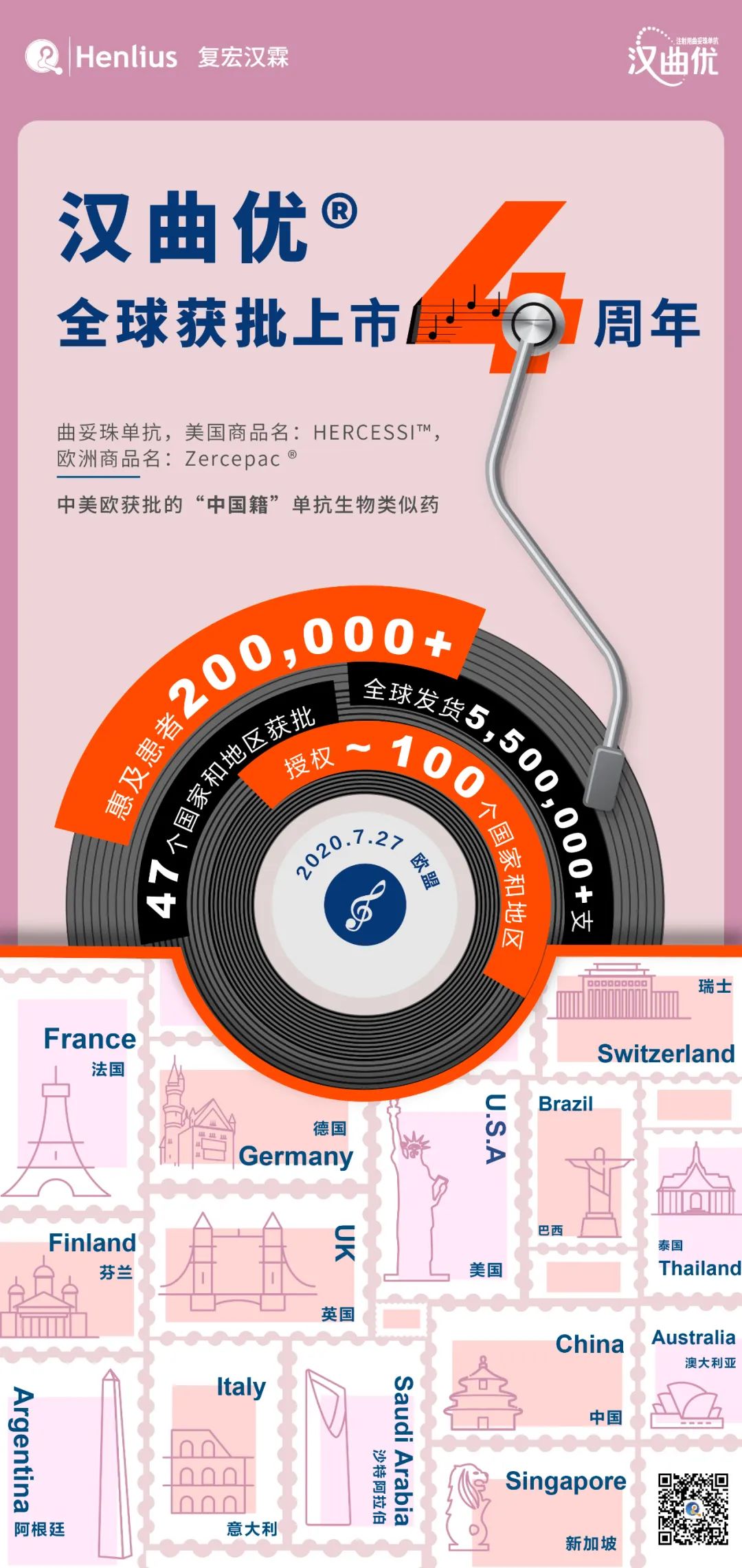 HANQUYOU (trastuzumab, trade name: HERCESSI? in the U.S., Zercepac??in Europe), the first China-developed trastuzumab biosimilar independently developed by Henlius, has been approved in China, the European Union (EU) and the United States (U.S.). As the pioneering Chinese mAb biosimilars?to go overseas, HANQUYOU was first approved in the EU on 27 July, 2020 and has been progressing?for four years with proven international quality. Up to now, it has?been approved in 47 countries and regions, benefiting 200,000+ patients, bringing affordable and high-quality treatment options to breast cancer and gastric cancer patients worldwide.?